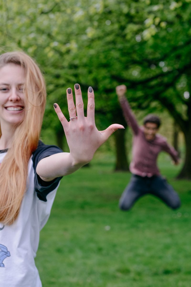 Mulher sorridente mostrando anel de noivado na mão estendida, com noivo saltando de alegria ao fundo.