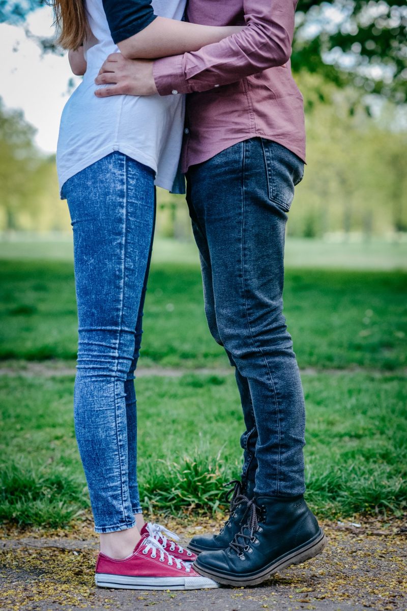 Casal se abraçando com destaque para pernas e calçados, tênis vermelho e bota preta, em parque verde.