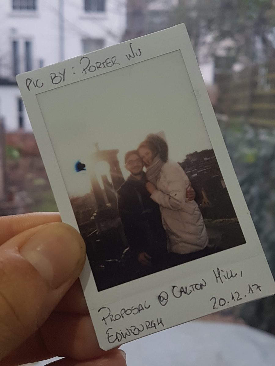 Foto instantânea sendo segurada na mão, mostrando um casal sorridente em proposta de casamento no Calton Hill, Edimburgo.