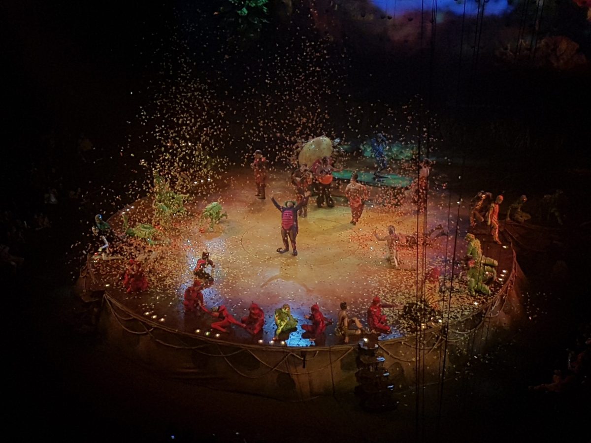 Espetáculo artístico com confetes e figurinos vibrantes.