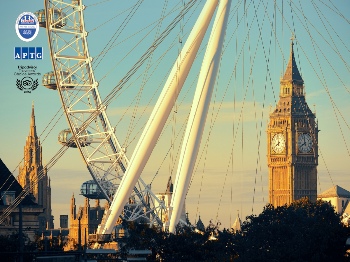 London Eye e Big Ben iluminados pelo pôr do sol.