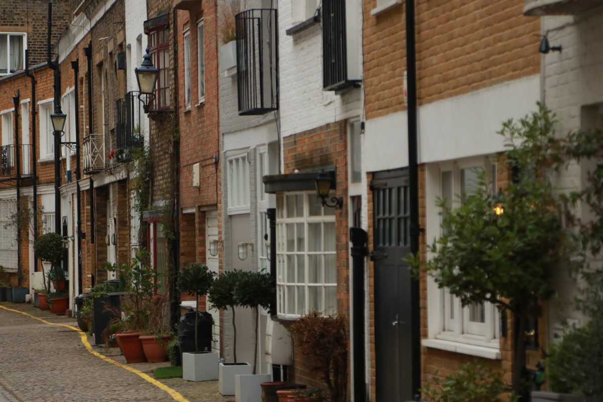 Casas de tijolos em rua residencial.
