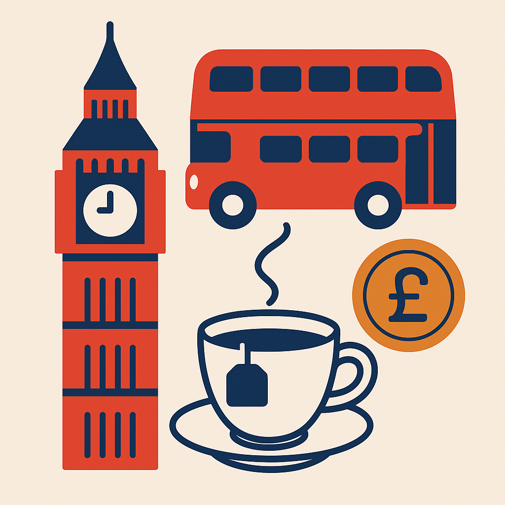 Ícones culturais de Londres - Big Ben, chá, ônibus vermelho e libra