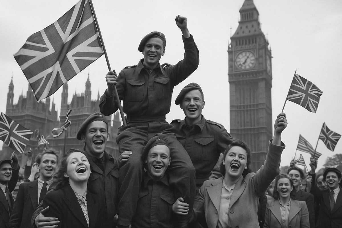 VE Day em Londres – celebração do fim da Segunda Guerra na Europa.