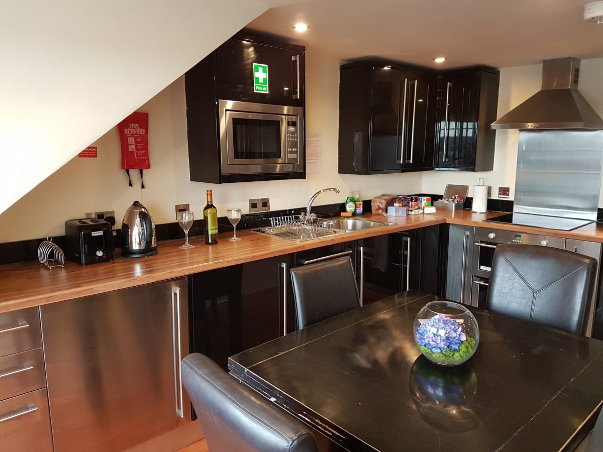 Cozinha moderna de apartamento em Edimburgo, equipada com eletrodomésticos e mesa de jantar.