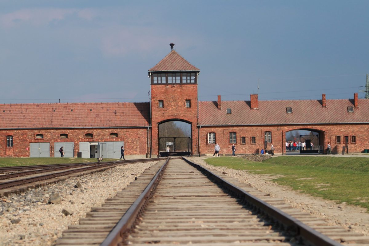 Portão principal de Auschwitz-Birkenau com trilhos de trem que levavam prisioneiros ao campo de concentração.